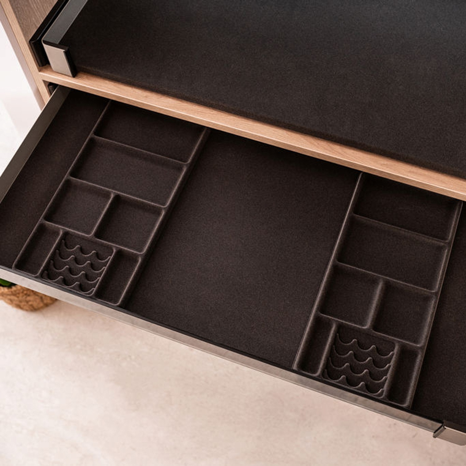 Особенно нежно с драгоценностями обращаются вкладки из флока: мягкий, бархатистый материал предотвращает царапины, скольжение и запутывание цепочек. Такой органайзер не просто хранит украшения — он заботится о них, как о самом дорогом. Идеальный подарок для тех, кто ценит порядок, красоту и внимание к деталям.